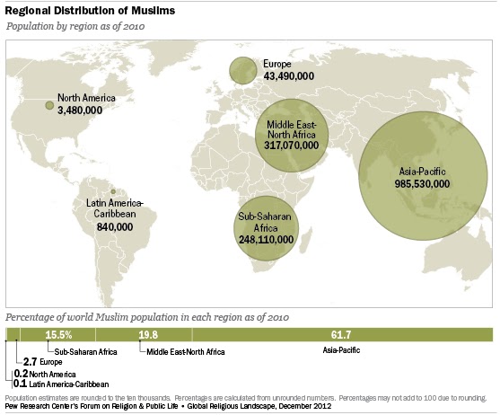 Muslims are concentrated in the Asia-Pacific region, where six-in-ten (62%) of all Muslims reside. Many Muslims also live in the Middle East and North Africa (20%) and sub-Saharan Africa (16%). The remainder of the world’s Muslim population is in Europe (3%), North America (less than 1%) and Latin America and the Caribbean (also less than 1%).